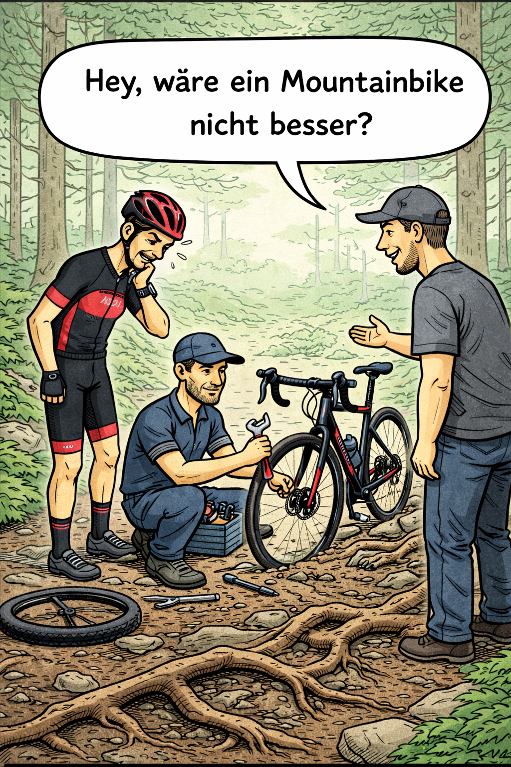 Doch sobald wir damit einen wurzeligen Single-Trail im Wald fahren, merken wir schnell: Für diesen Kontext ist das Rennrad nicht geeignet.